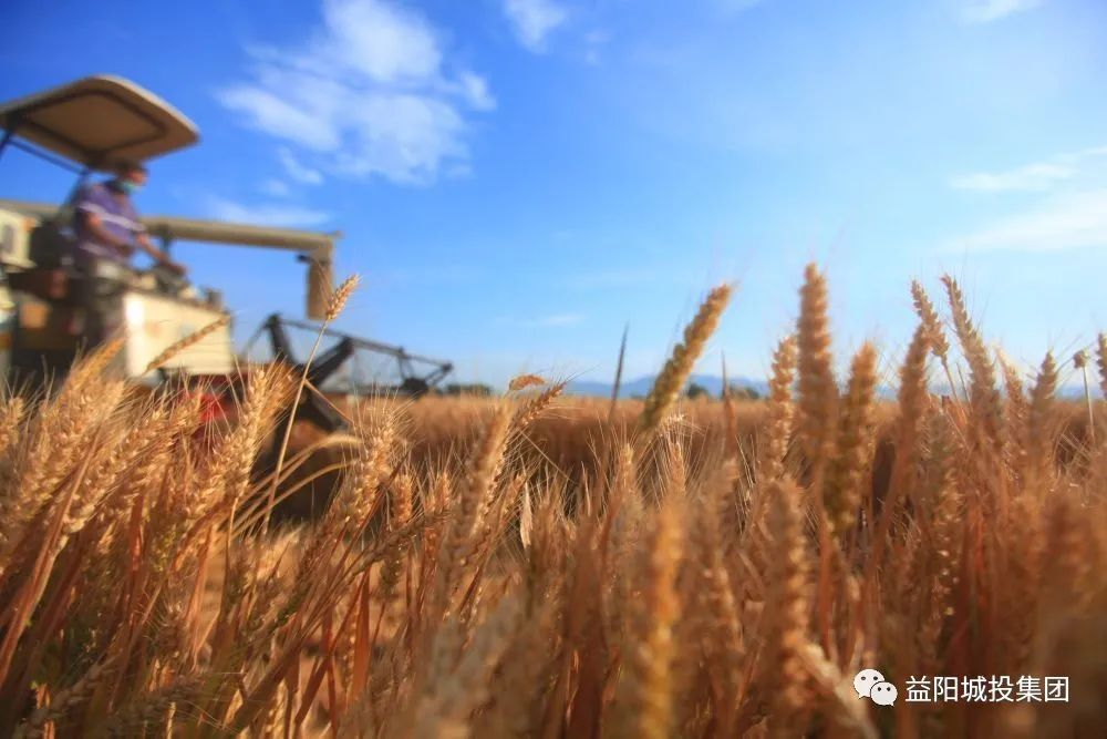 △收割機在山東省臨沂市平邑縣的麥田里收割小麥(2021年6月8日攝)。