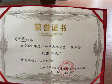 2021年度工作中我還有幸獲得了先進個人的稱號。薄薄的一張獎狀,上面卻承載著公司對我寄予的厚重期望。我深知這是公司對我的認(rèn)可與信任。這讓我明白了我所付出的努力都是值得的,都被公司的領(lǐng)導(dǎo)們和同事們看在眼里,想在心里。我將這份感激銘記于心,但我不會止步于此,我要讓越來越多的人看到我的努力、讓越來越多的人認(rèn)可我,我將以此為契機繼續(xù)努力奮斗,創(chuàng)造更好的成績!未來的日子,我將肩負(fù)起屬于我的這份責(zé)任,以城投為家,與城投共成長!